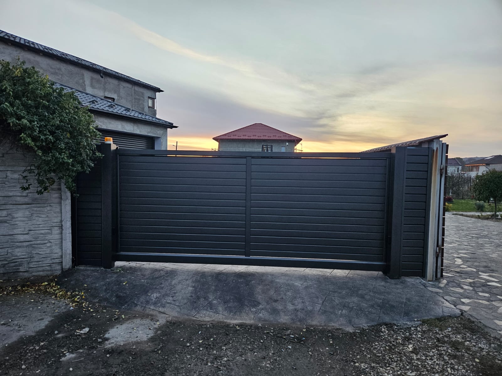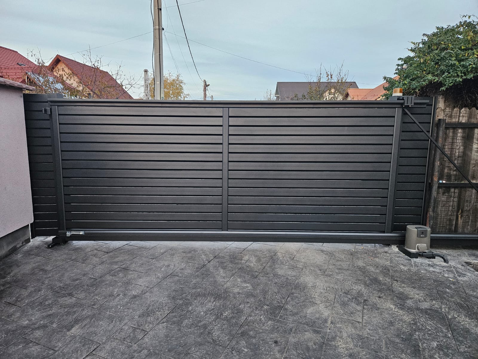 - Am finalizat montajul unei porți autoportante deosebite, fără șină jos, complet automatizată, alături de panourile de gard laterale din aluminiu și stâlpi îmbrăcați pentru un design modern și funcționalitate maximă.